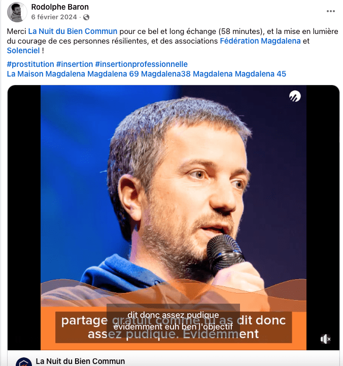 Lors de la séance publique de ce vendredi 17 octobre, c’est une autre association liée à ce réseau, SOLENCIEL, qui s’est vue attribuée une subvention de 93 790 € au titre de l’aide à l’insertion des femmes en parcours de sortie de prostitution. J’ai donc pris la parole pour alerter sur cette nouvelle tentative d’entrisme de l’extrême droite dans notre territoire. En effet, cette association a participé à plusieurs Nuits du Bien Commun depuis sa création. Leua dernière participation remonte à mai 2025..